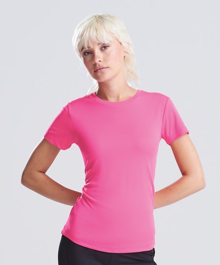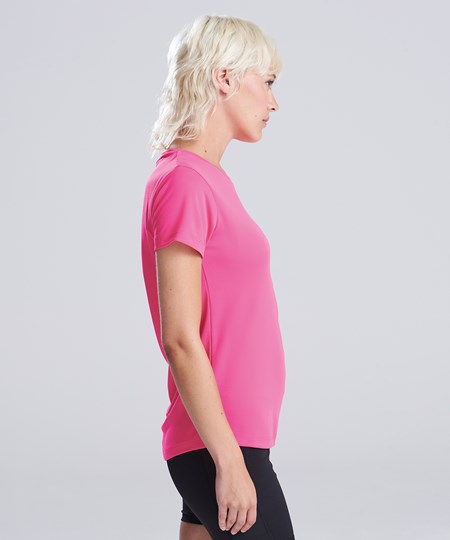 Ce T-shirt de coupe féminine est taillé dans un tissu Neoteric™ léger qui permet d’évacuer l’humidité de votre peau. Avec son col rond uni et ses mancherons, sa conception sans limite en fait une pièce essentielle de votre garde-robe sportive.